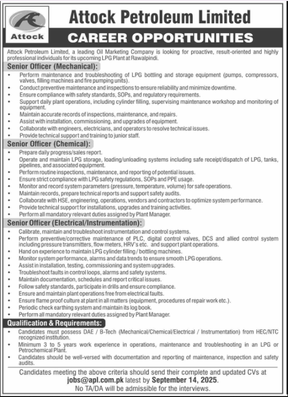 Only male candidates can apply for this Attock Petroleum Limited Jobs In Rawalpindi September 2025 Qualification /Experience Required: Candidates must possess DAE / B-Tech (Mechanical/Chemical/Electrical/Instrumentation) from HEC/NTC recognized institution. Minimum 3 to 5 years work experience in operations, maintenance and troubleshooting in an LPG or Petrochemical Plant. Candidates should be well-versed with documentation and reporting of maintenance, inspection and safety audits. Prepare daily progress/sales report. Operate and maintain LPG storage, loading/unloading systems including safe receipt/dispatch of LPG, tanks, pipelines, and associated equipment. Perform routine inspections, maintenance, and reporting of potential issues. Ensure strict compliance with LPG safety regulations, SOPs and PPE usage. Monitor and record system parameters (pressure, temperature, volume) for safe operations. Maintain records, prepare technical reports and support safety audits. Collaborate with HSE, engineering, operations, vendors and contractors to optimize system performance. Provide technical support for installations, upgrades and training activities. Perform all mandatory relevant duties assigned by Plant Manager. and more experienced candidates should apply before 14 September 2025.