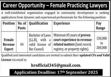 Only male candidates can apply for A Well-Established Organization Jobs In Karachi September 2025Qualification /Experience Required:Bachelor of Laws, Minimum 05 years of proven (LL.B), with a valid license of the Bar Council, experience in revenue-related matters (land record, registry, or property rights)and more experienced candidates should apply before 17 September 2025.