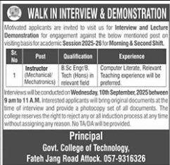 Candidates if you are seeking Govt College Of Technology Jobs In Attock September 2025 if yes. It would be best if you tried to complete readGovt College Of Technology job because you can easily apply for these vacancies Instructor (Mechanical Mechatronics).