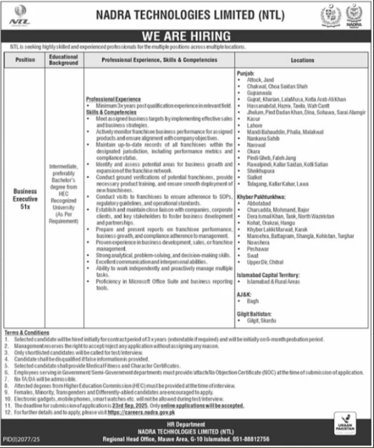 Candidates if you are seeking Nadra Technologies Limited Jobs In Islamabad September 2025 if yes. It would be best if you tried to complete read Nadra Technologies Limited’s bjob ecause you can easily apply for these vacancies Business Executive 51x.