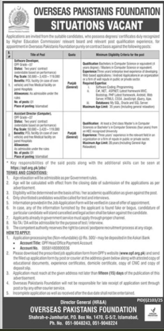 Candidates, if you are seeking Overseas Pakistanis Foundation Jobs In Islamabad, September 2025 if yes. It would be best if you tried to complete read the Overseas Pakistanis Foundation job because you can easily apply for these vacancies, Software Developer OFF Grade-07 St Two years corect dependable based on performance pand Allowances as admissible under the res No. of posts .