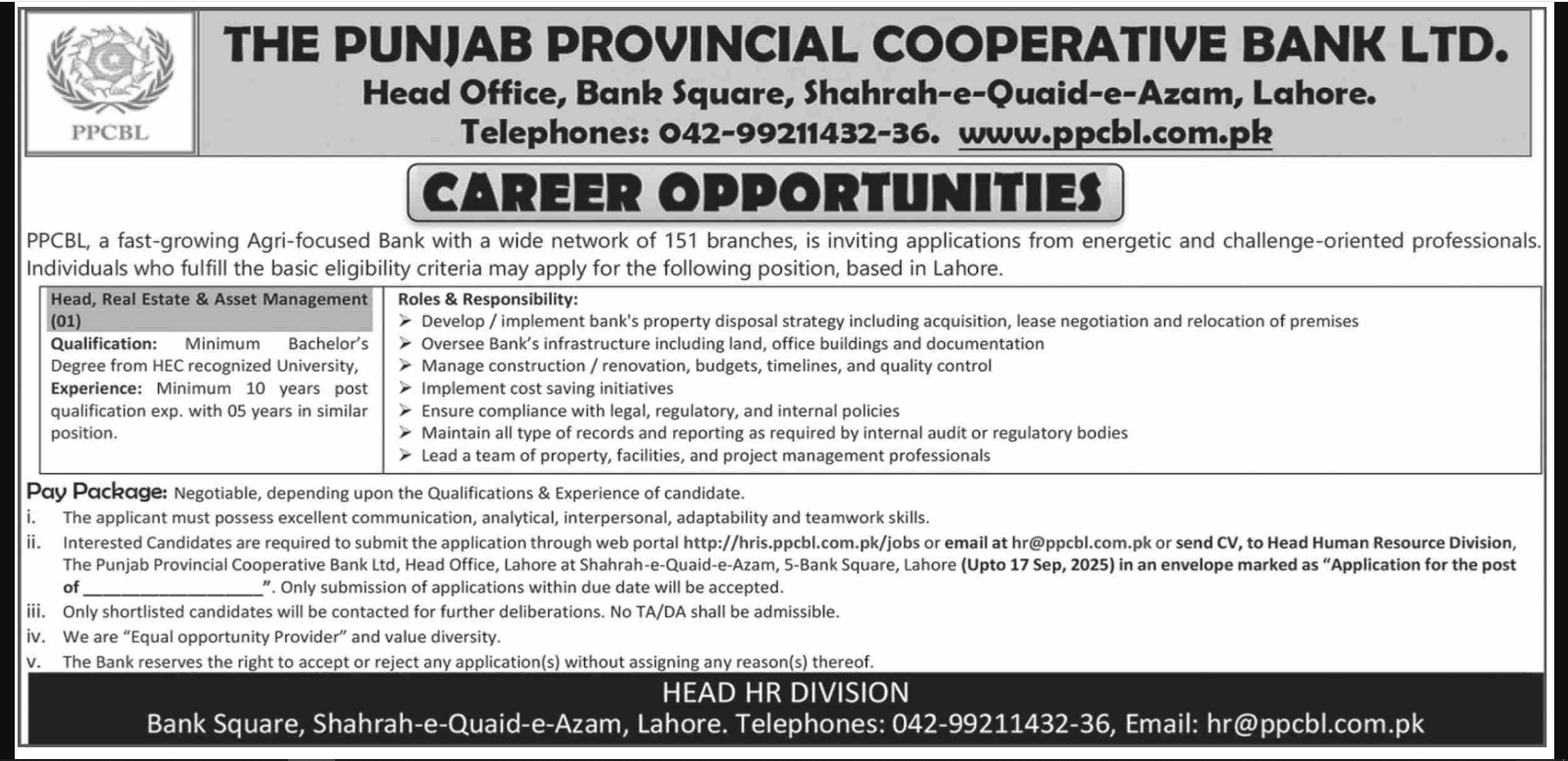 Only male candidates can apply for this The Punjab Provincial Cooperative Bank LTD Jobs In Lahore October 2025 Qualification /Experience Required: Minimum Bachelor’s Degree from HEC recognized University, Experience: Minimum 10 years post qualification exp. with 05 years in similar position. Develop/implement bank’s property disposal strategy including acquisition, lease negotiation and relocation of premises Oversee Bank’s infrastructure including land, office buildings and documentation Manage construction/renovation, budgets, timelines, and quality control Implement cost saving initiatives Ensure compliance with legal, regulatory, and internal policies Maintain all type of records and reporting as required by internal audit or regulatory bodies Lead a team of property, facilities, and project management professionals and more experienced candidates should apply before 17 September 2025.