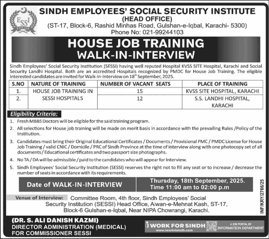 Only male candidates can apply for this Sindh Employees Social Security Institute Jobs September 2025 Qualification /Experience Required: Fresh MBBS Doctors will be eligible for the said training program. All selections for House job training will be made on merit basis in accordance with the prevailing Rules/Policy of the Institution. Candidates must bring their Original Educational Certificates/Documents/Provisional PMC/PMDC License for House Job Training/valid CNIC/Domicile/PRC of Sindh Province at the time of interview along with one photocopy set of all documents/Educational certificates and two passport size photographs. No TA/DA will be admissible/paid to the candidates who will appear for Interview. Sindh Employees’ Social Security Institution (SESSI) reserves the right not to fill any seat or to increase/decrease the number of seats in accordance with its requirements. and more experienced candidates should apply before 18 September 2025.
