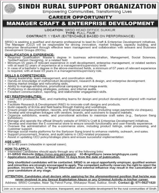 Only male candidates can apply for Sindh Rural Support Organization Jobs In Sindh September 2025 Qualification /Experience Required: Required Qualification: Master’s degree in business administration, Management, Social Sciences, Textile/Fashion Designing, or a related field Minimum 05 years of relevant experience in craft development, enterprise management, or related sectors with at least 02 years of experience management/supervisory level., and more experienced candidates should apply before 14 September 2025.