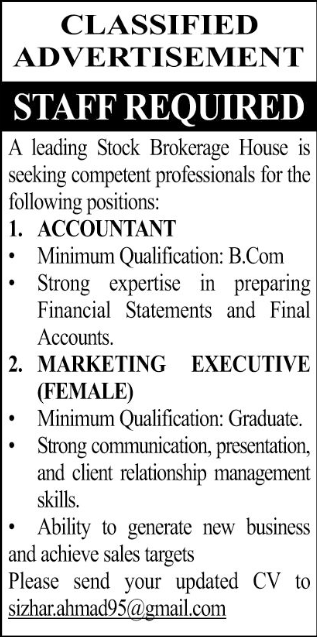 Only male candidates can apply for .Stock Brokerage House Jobs In Karachi, September 2025 Qualification /Experience Required: Minimum Qualification: Graduate. Strong communication, presentation, and client relationship management skills. Ability to generate new business and more experienced candidates should apply before 14 September 2025.