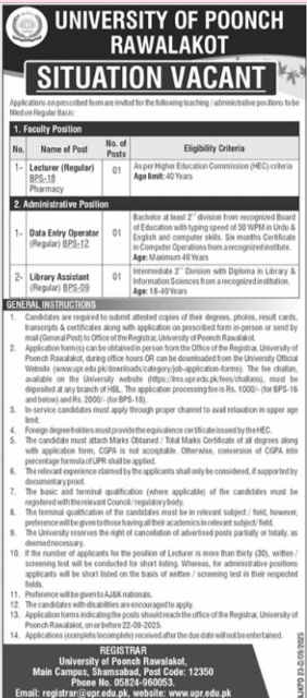 Candidates if you are seeking University Of Poonch Rawalakot Campus Jobs In September 2025 if yes. It would be best if you tried to complete read the Poonch Rawalakot Campus job because you can easily apply for these vacancies Lecturer (Regular) BPS-18, Pharmacy Administrative Positi Data Entry Operator (Regular) BPS-12 Library Assistant (Regular) BPS-09.
